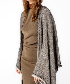Women’s poncho with linear print in an elegant and sober style. Its fabric is ultra-soft to the touch and very warm, perfect for autumn and winter days. Its ends are frayed, and as an original detail, we can see the visible zigzag seams. A very easy to combine accessory and perfect to accompany you in the colder months. One size.