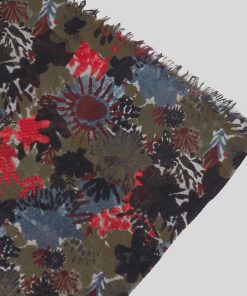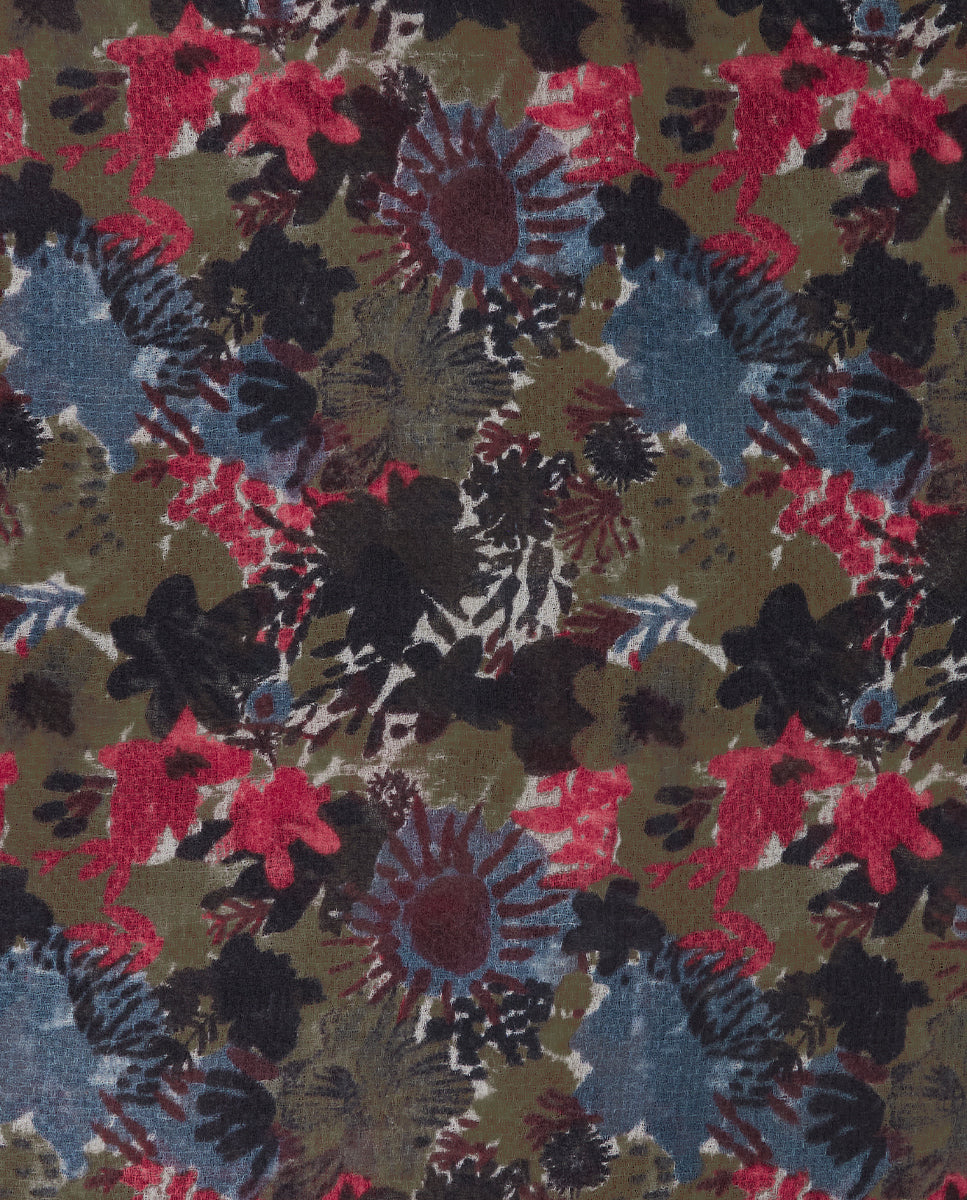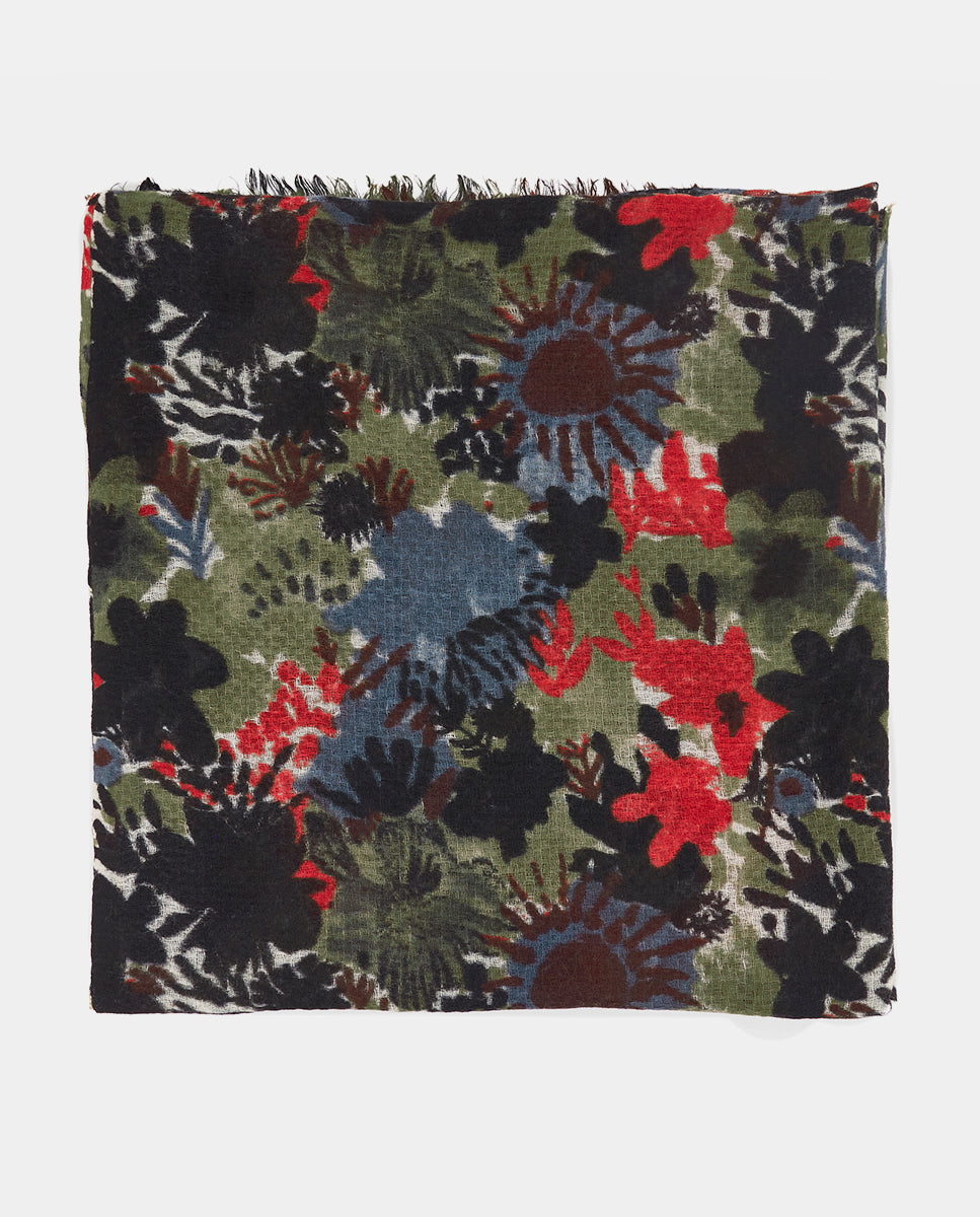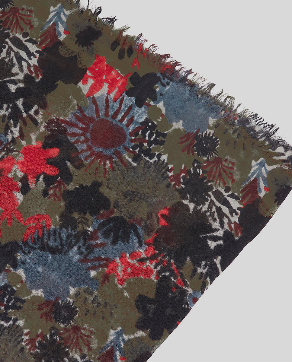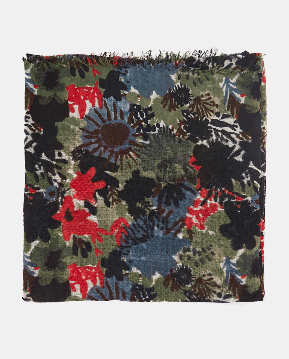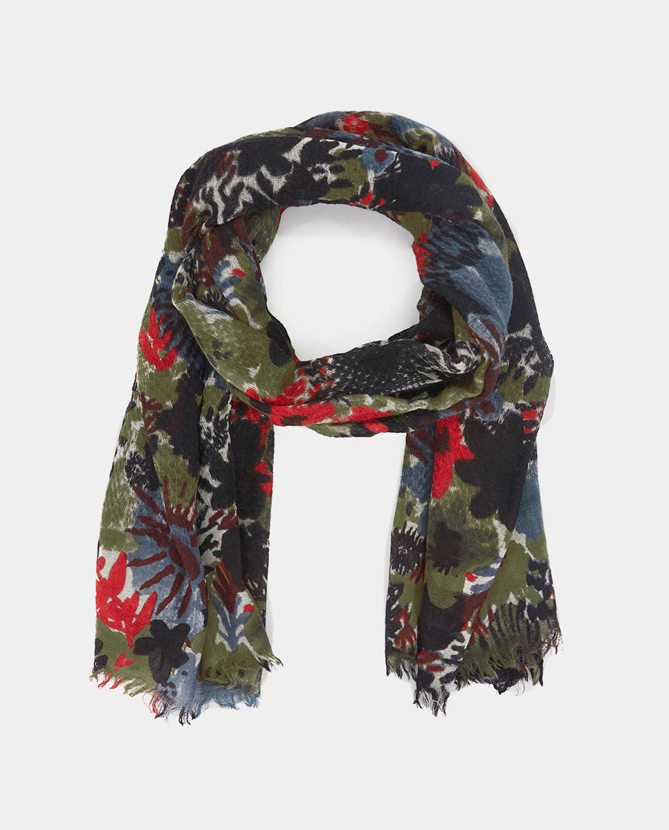 Soft, lightweight wool scarf with a maxi floral print. A versatile and functional accessory, ideal for any occasion. Frayed edges.