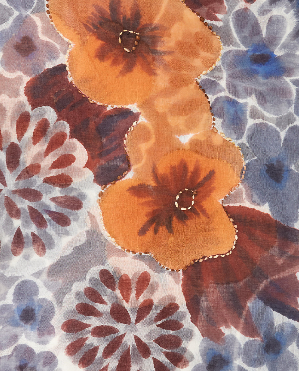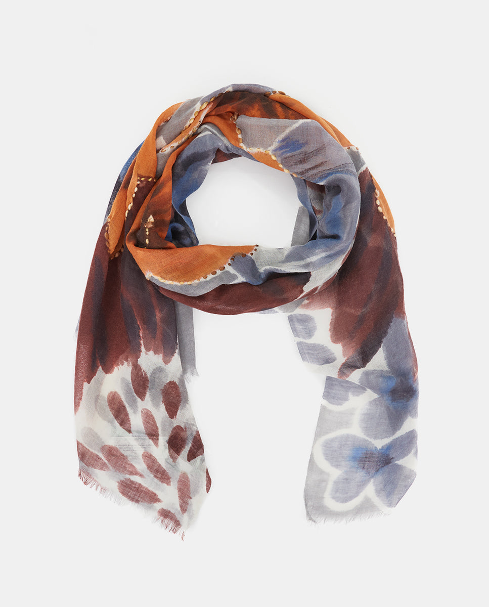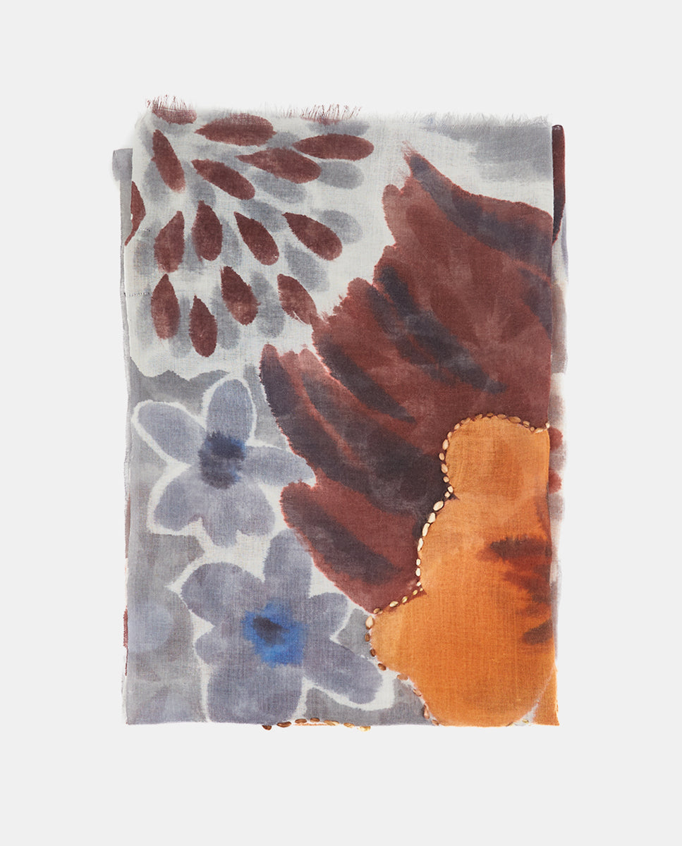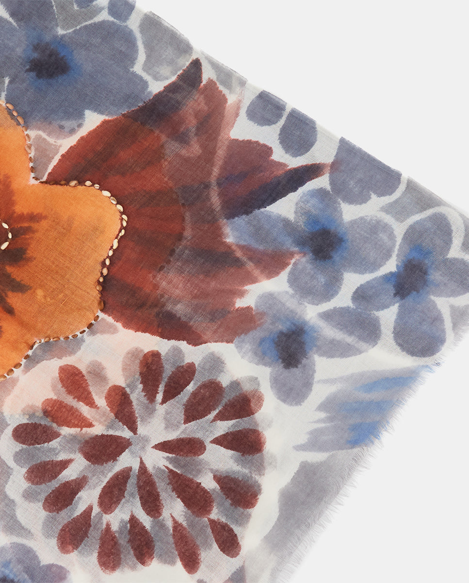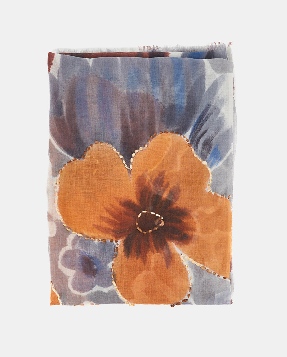Soft, lightweight wool scarf with a maxi floral print. A versatile and functional accessory, ideal for any occasion. Frayed edges.