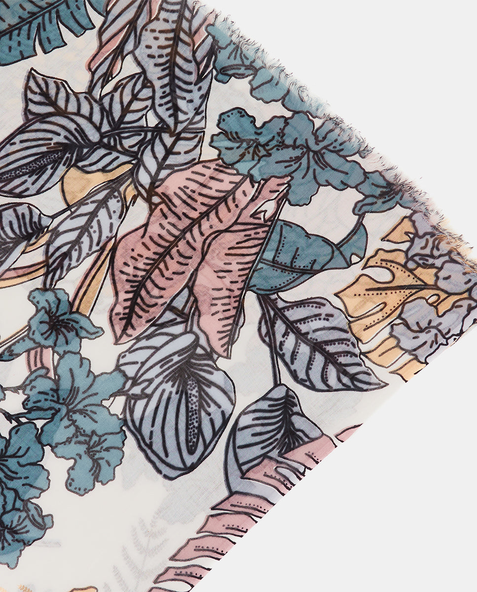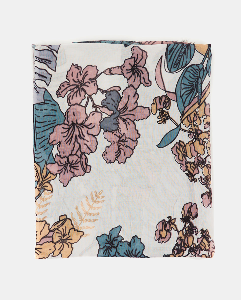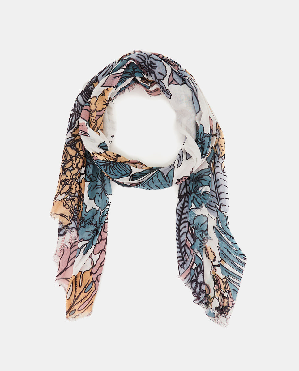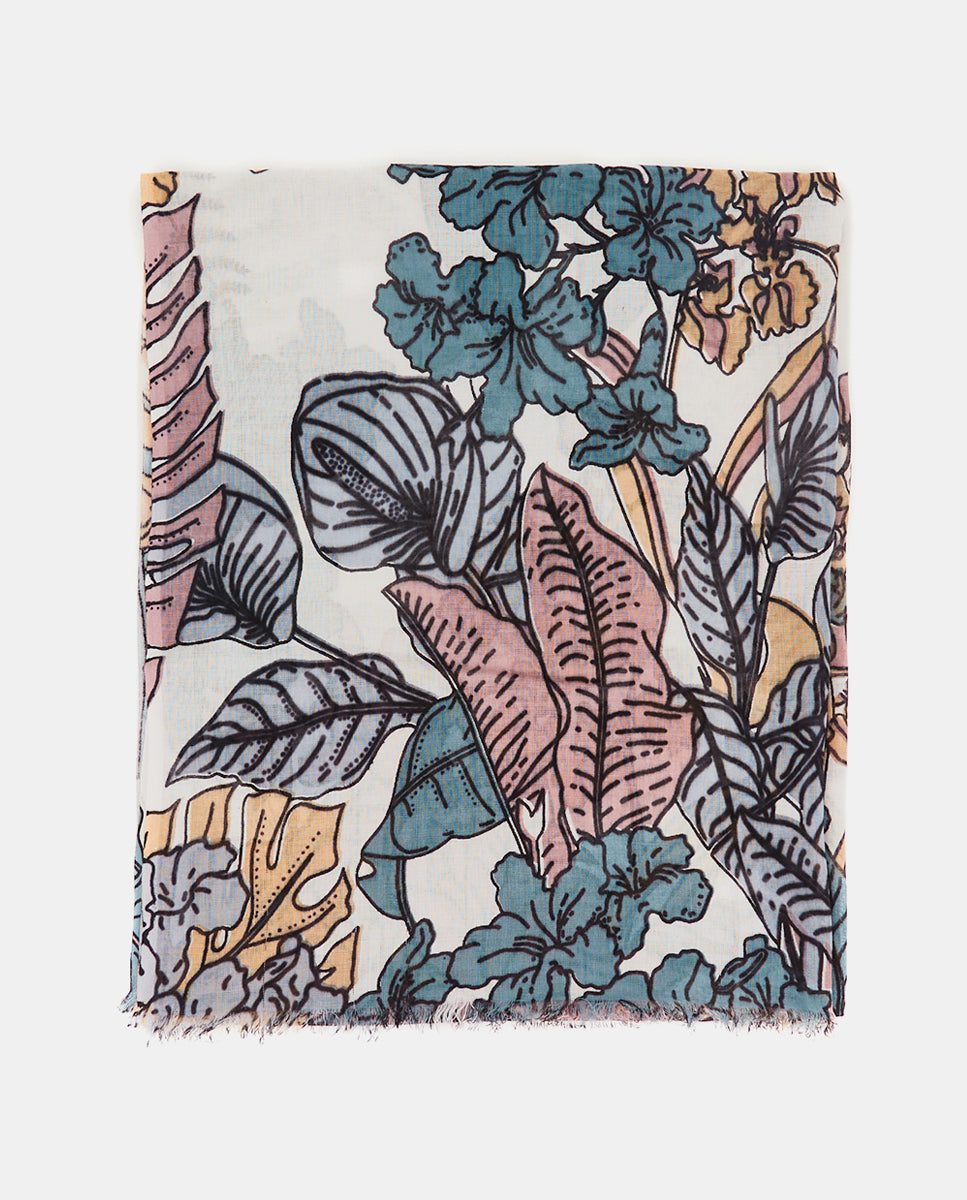 Women’s scarf with a floral print made of viscose. This design combines various tones, creating a striking and elegant color play, perfect to complement any summer look. Its frayed edges add a more casual style.