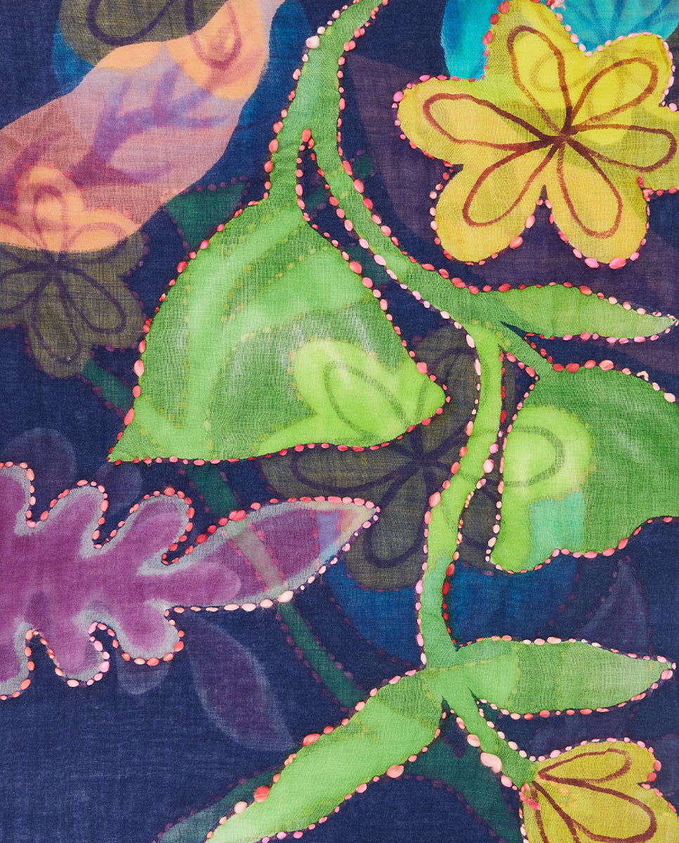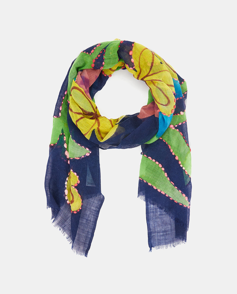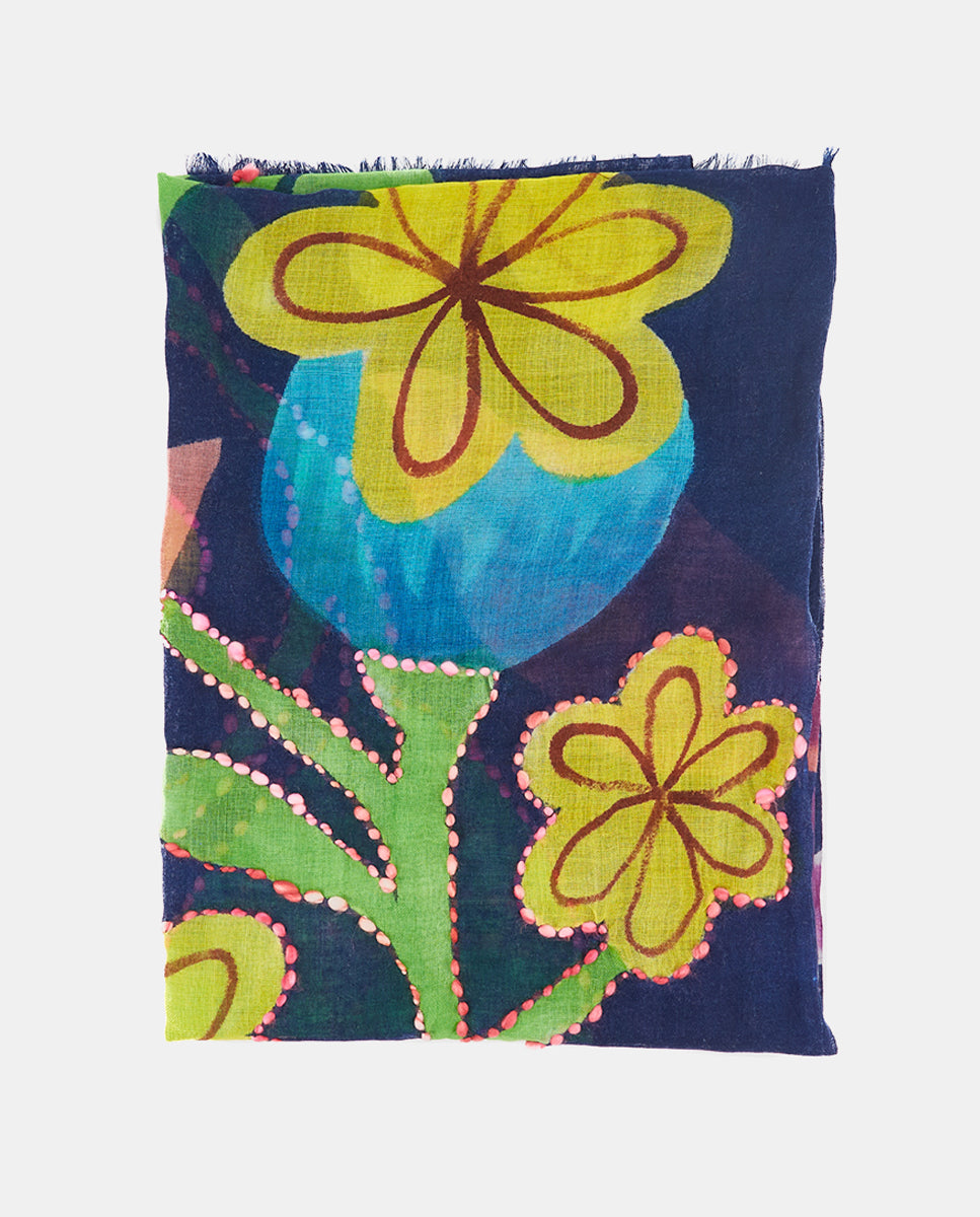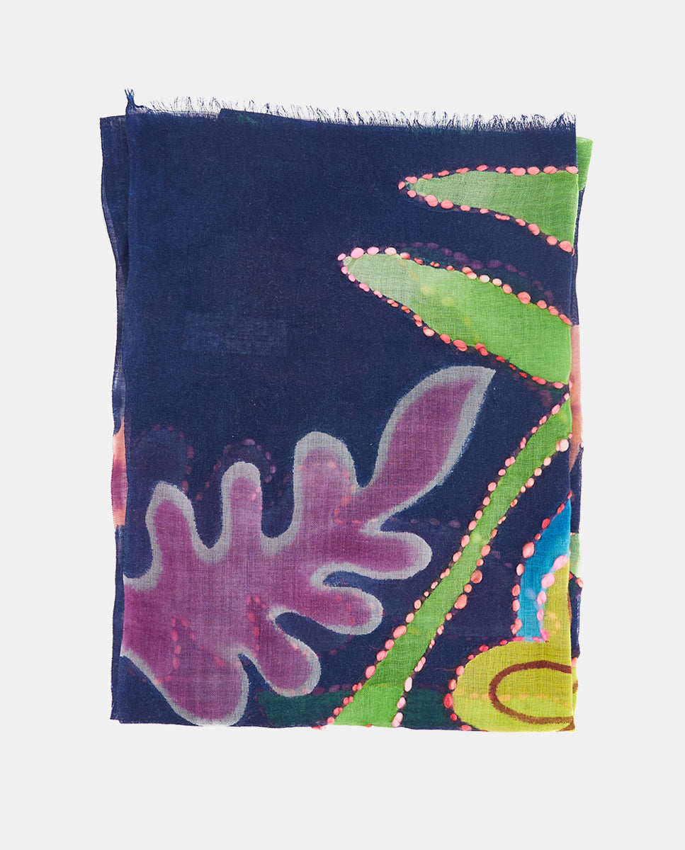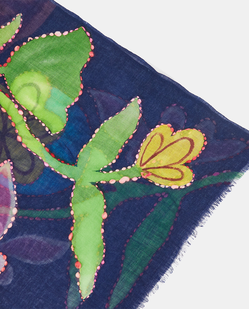 Soft, lightweight wool scarf with a maxi floral print. A versatile and functional accessory, ideal for any occasion. Frayed edges.