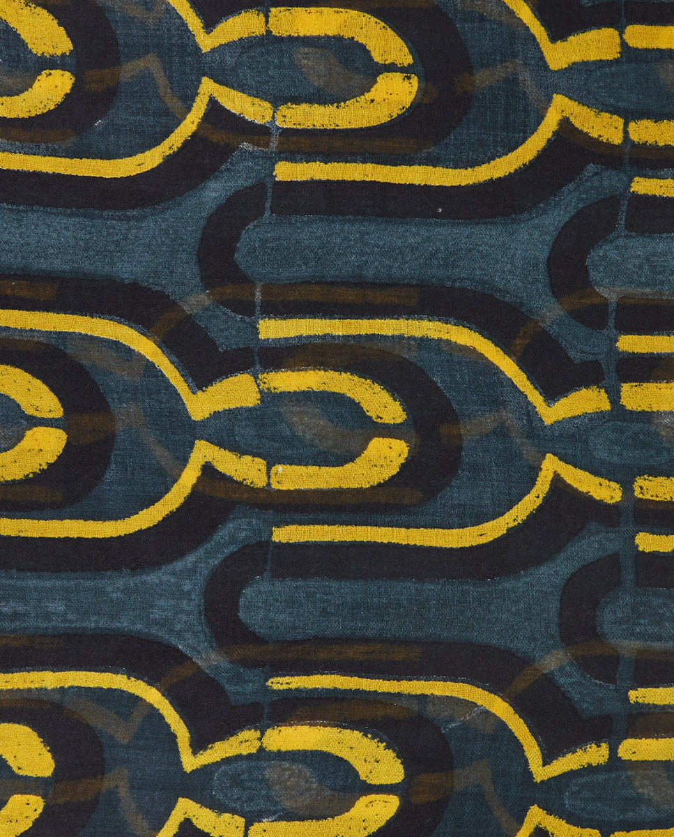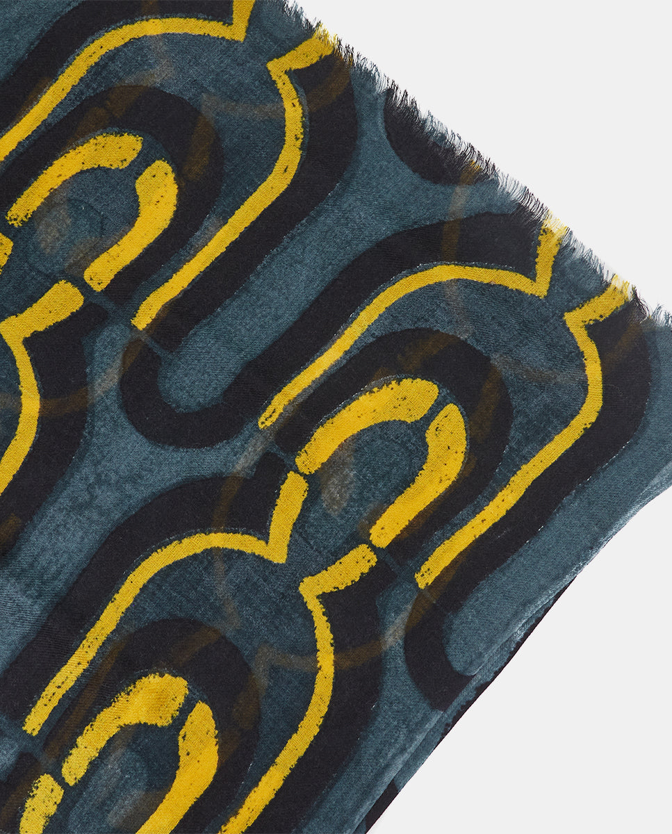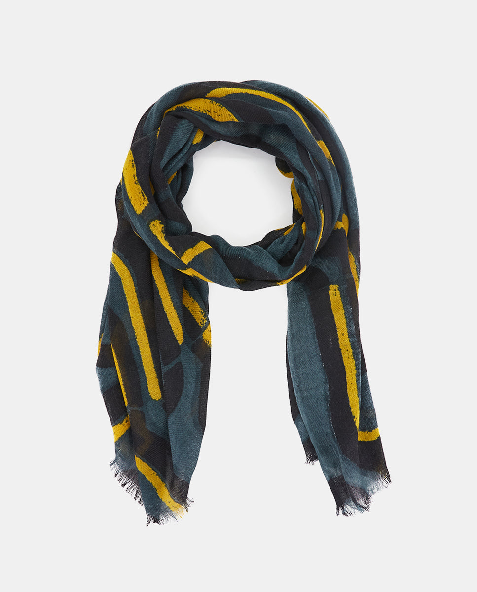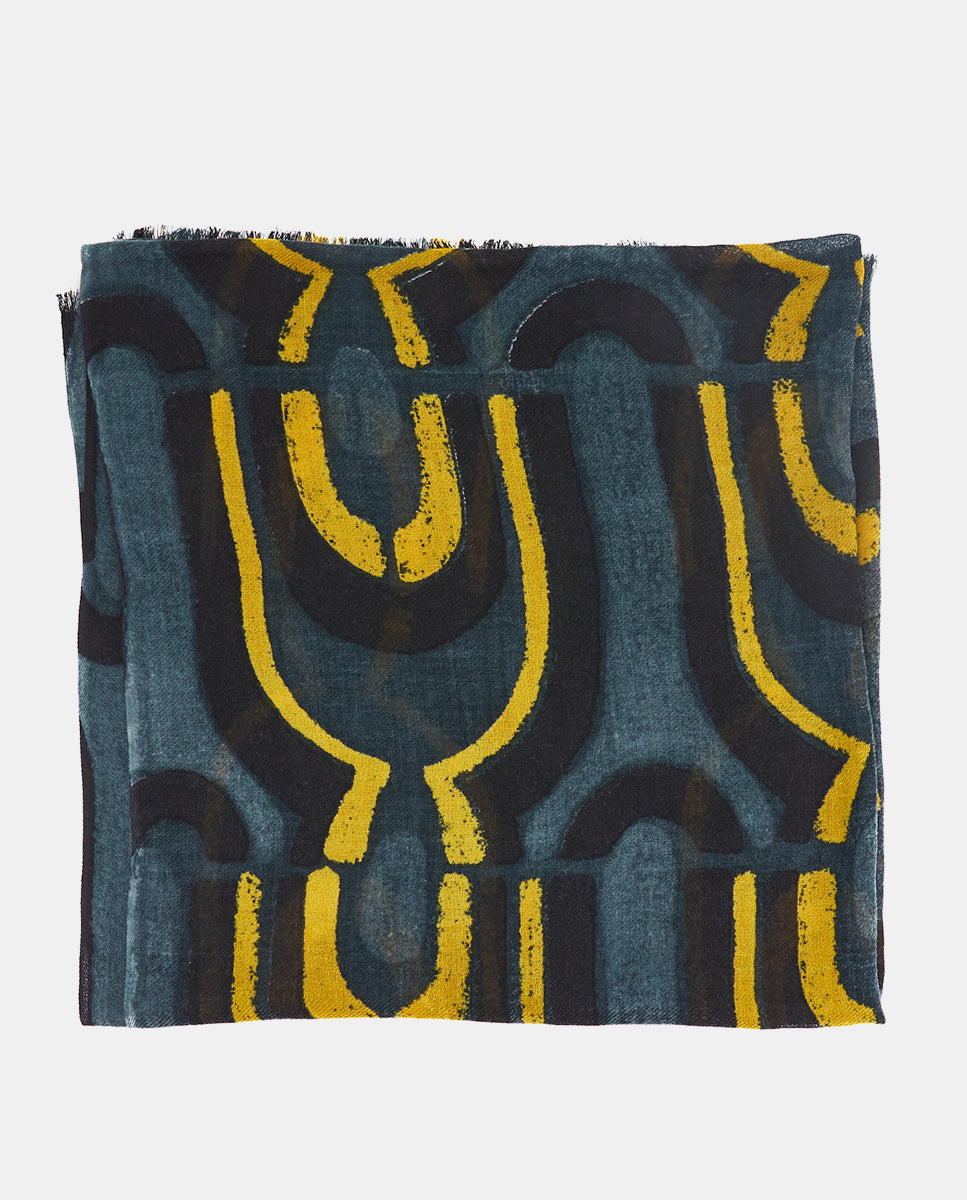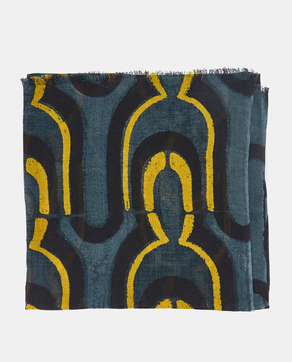 Soft, lightweight wool scarf with an abstract print. A versatile and functional accessory, ideal for any occasion. Frayed edges.