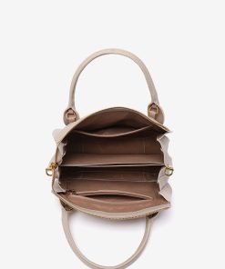 • The exterior features several pockets, decorative visible seams, and a zipper closure.