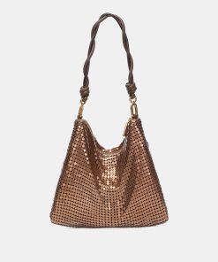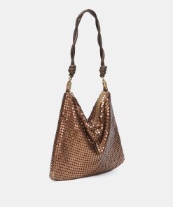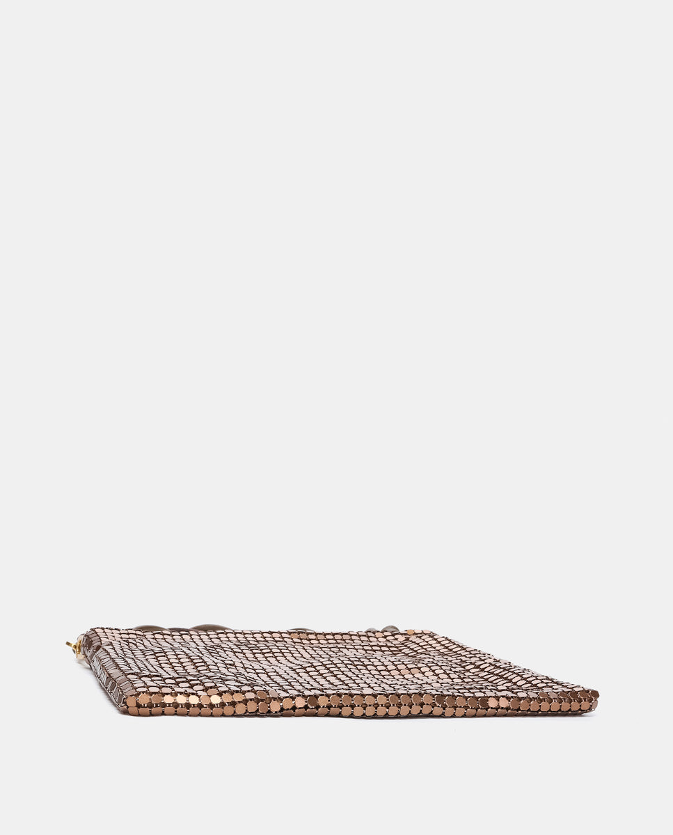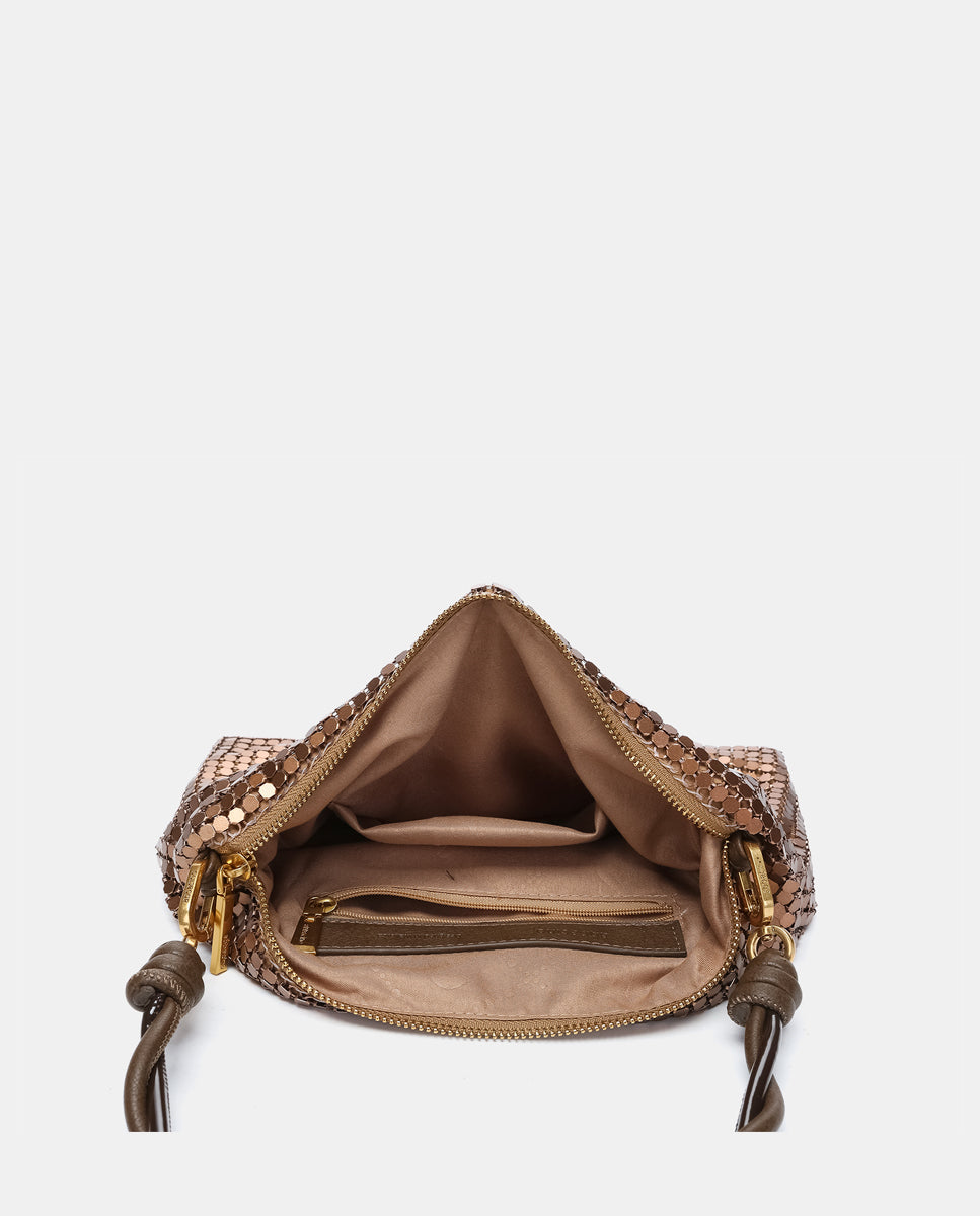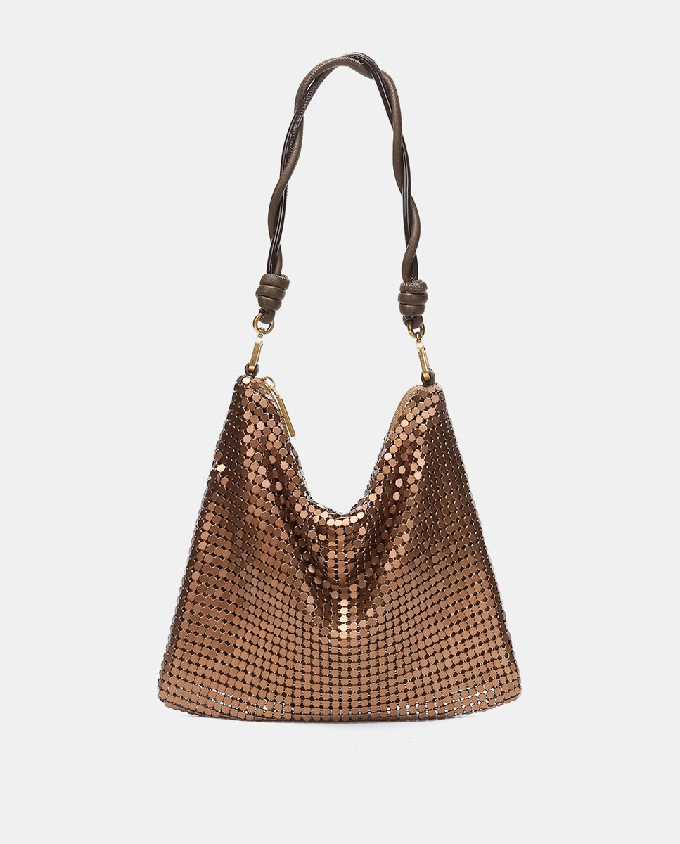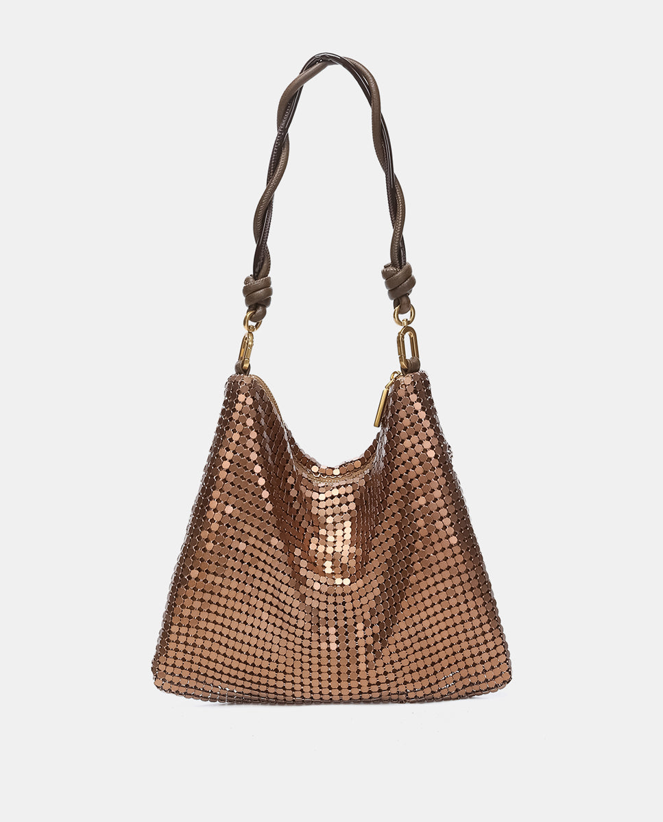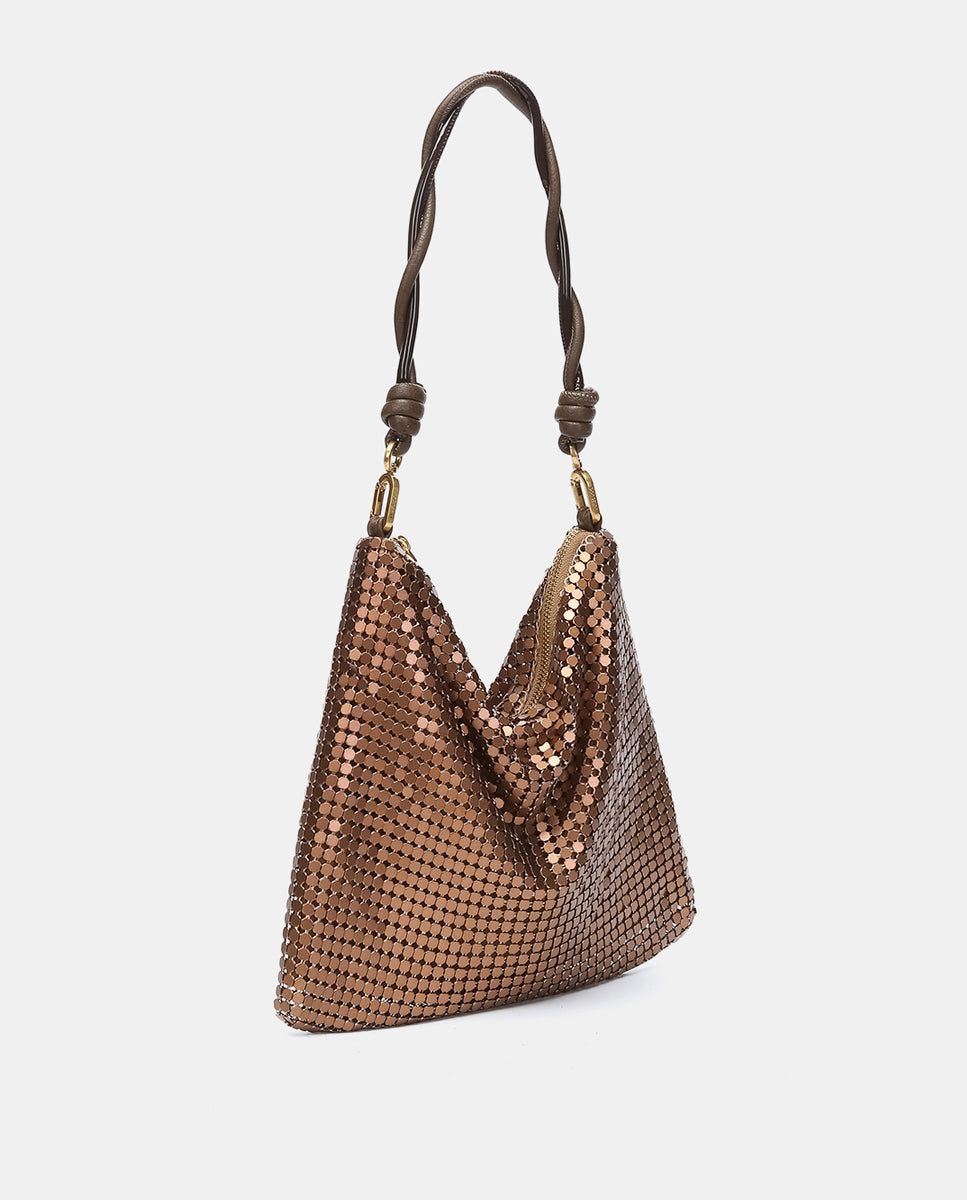 Pyramid-shaped evening shoulder bag made of metallic mesh, with a modern and striking design. Ideal for shining at any event, it combines originality and functionality. Its main features are: