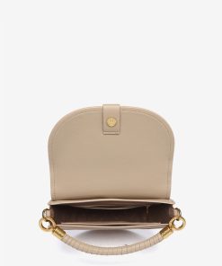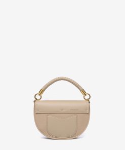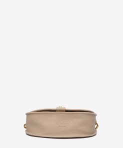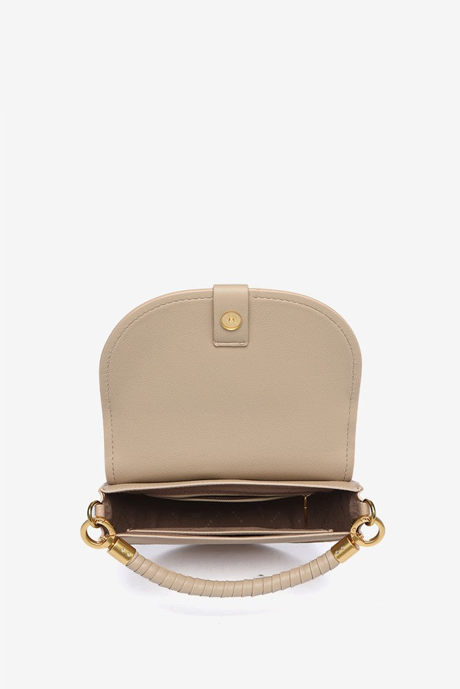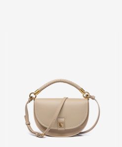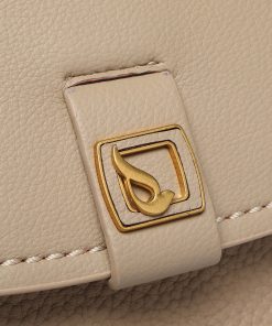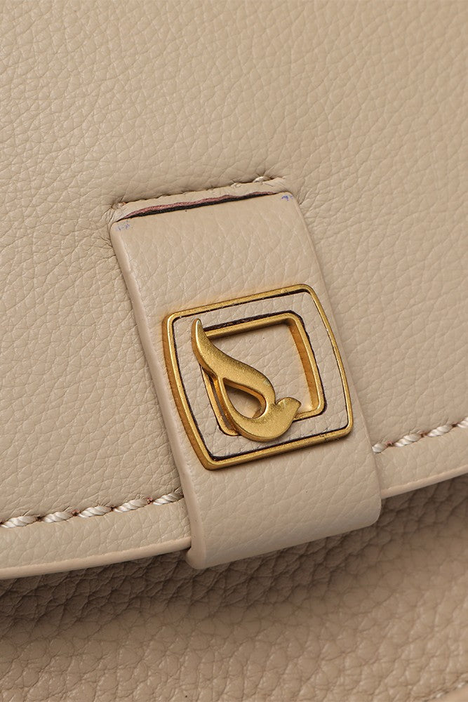 • Front flap closure with a metallic appliqué featuring the brand’s logo.