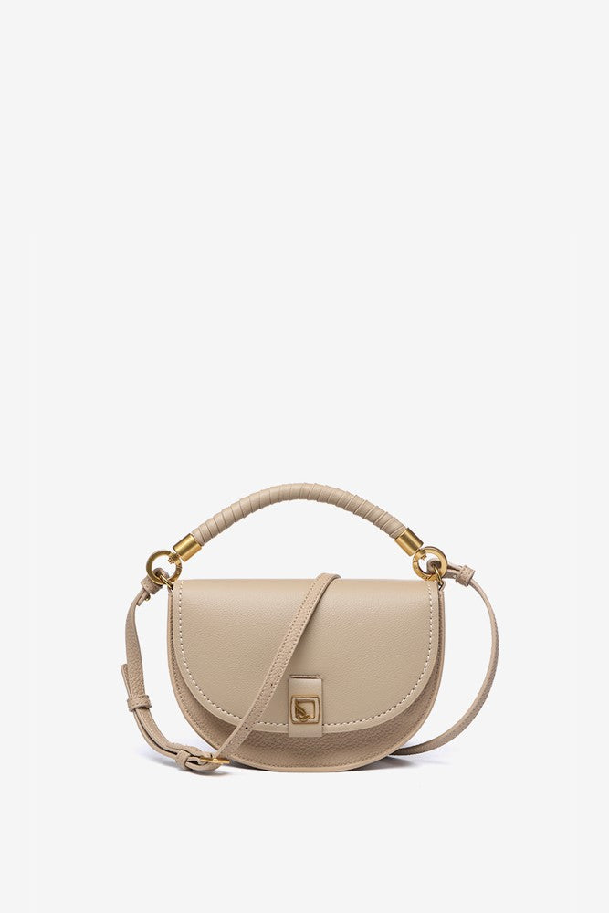 Women’s crossbody bag in half-moon format made from recycled materials. A new silhouette in our catalog that follows the latest trends of the moment. Its youthful style, clean and simple lines, golden details, and range of colors make this accessory a very special design and a true gem this season. Its main features are: