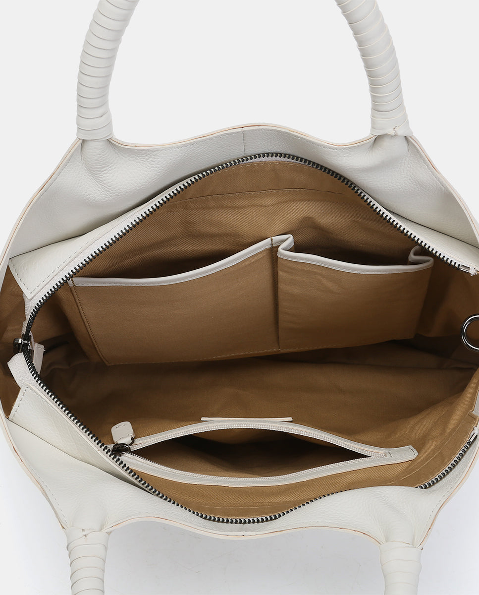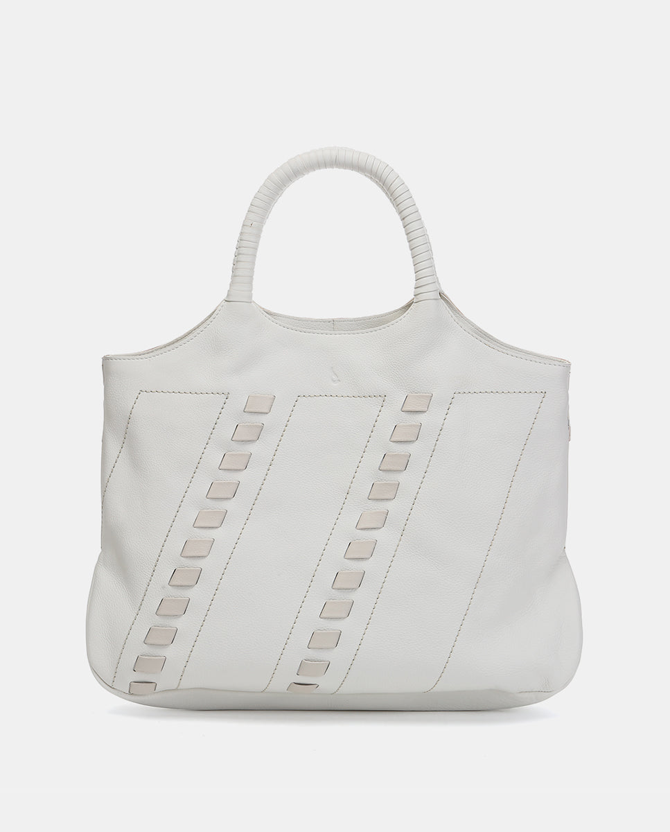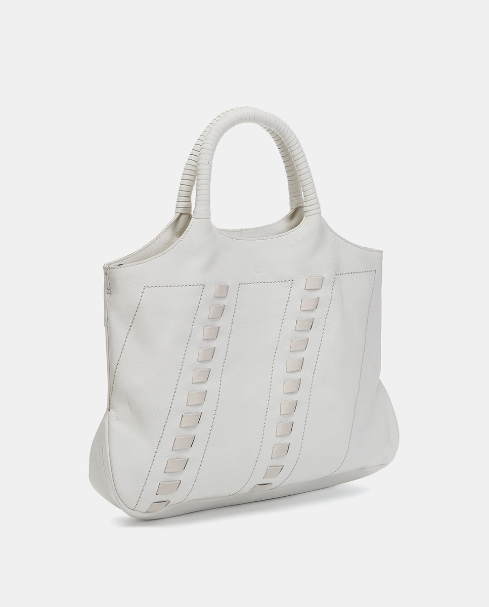 Shopper bag made of premium leather. A model that stands out for its unique and sophisticated design. Its soft, neutral colors make it a versatile accessory that is easy to combine for both casual and formal occasions. The design features leather strips across the front surface, creating an original visual effect. The fine contrast stitching adds a touch of distinction, highlighting the craftsmanship of the product. Its main features are: