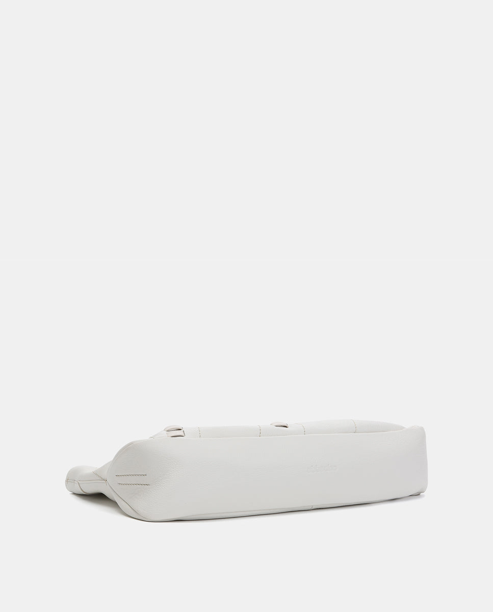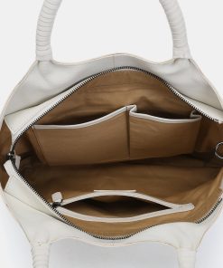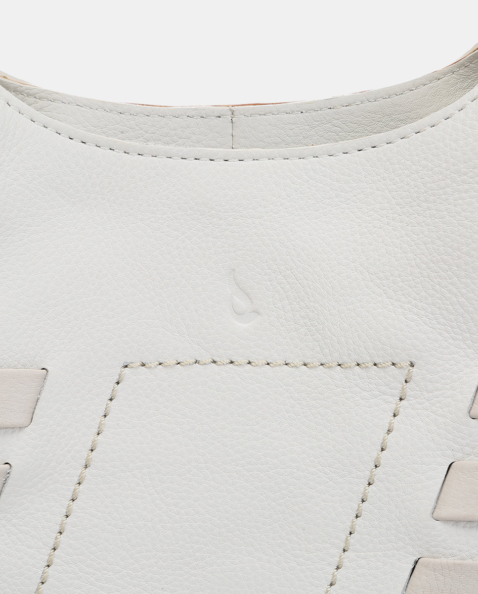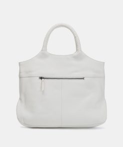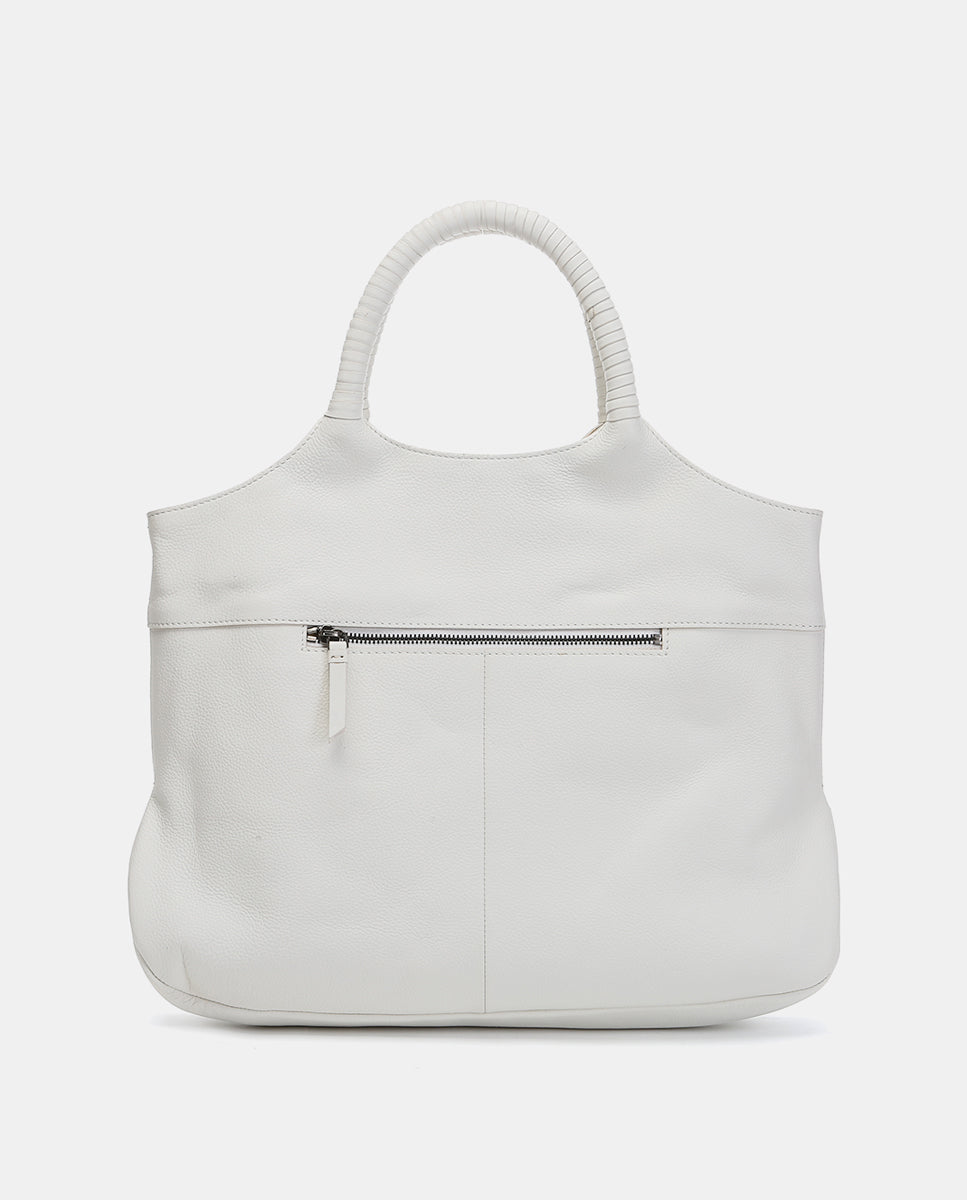 Shopper bag made of premium leather. A model that stands out for its unique and sophisticated design. Its soft, neutral colors make it a versatile accessory that is easy to combine for both casual and formal occasions. The design features leather strips across the front surface, creating an original visual effect. The fine contrast stitching adds a touch of distinction, highlighting the craftsmanship of the product. Its main features are: