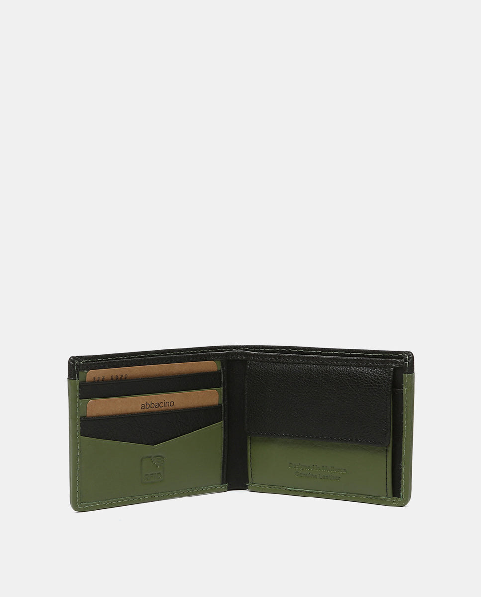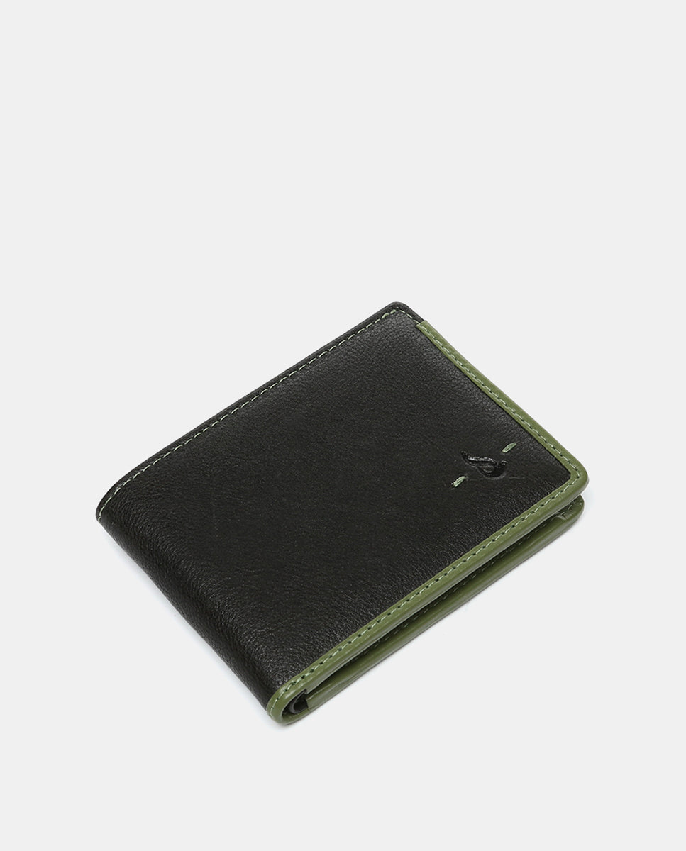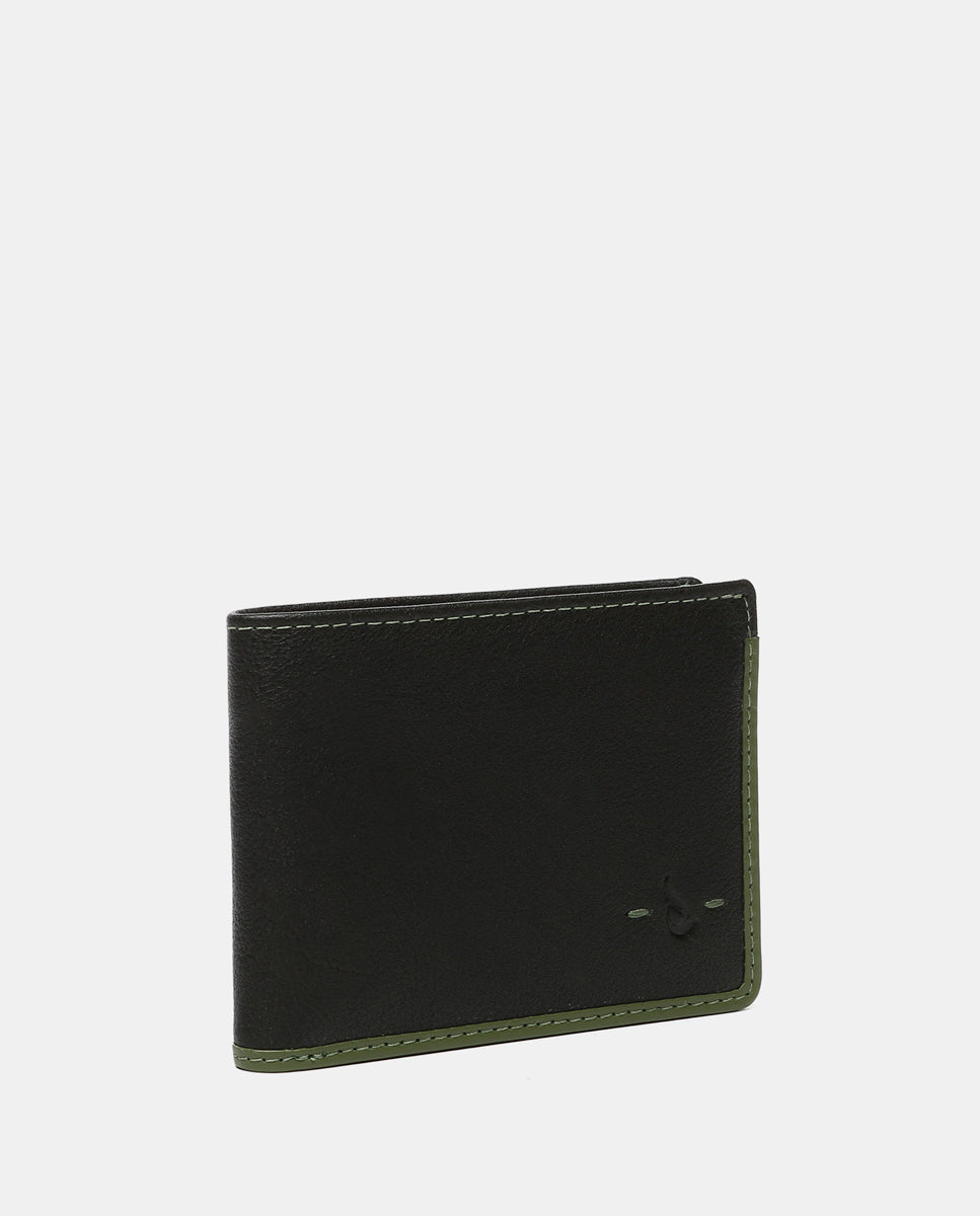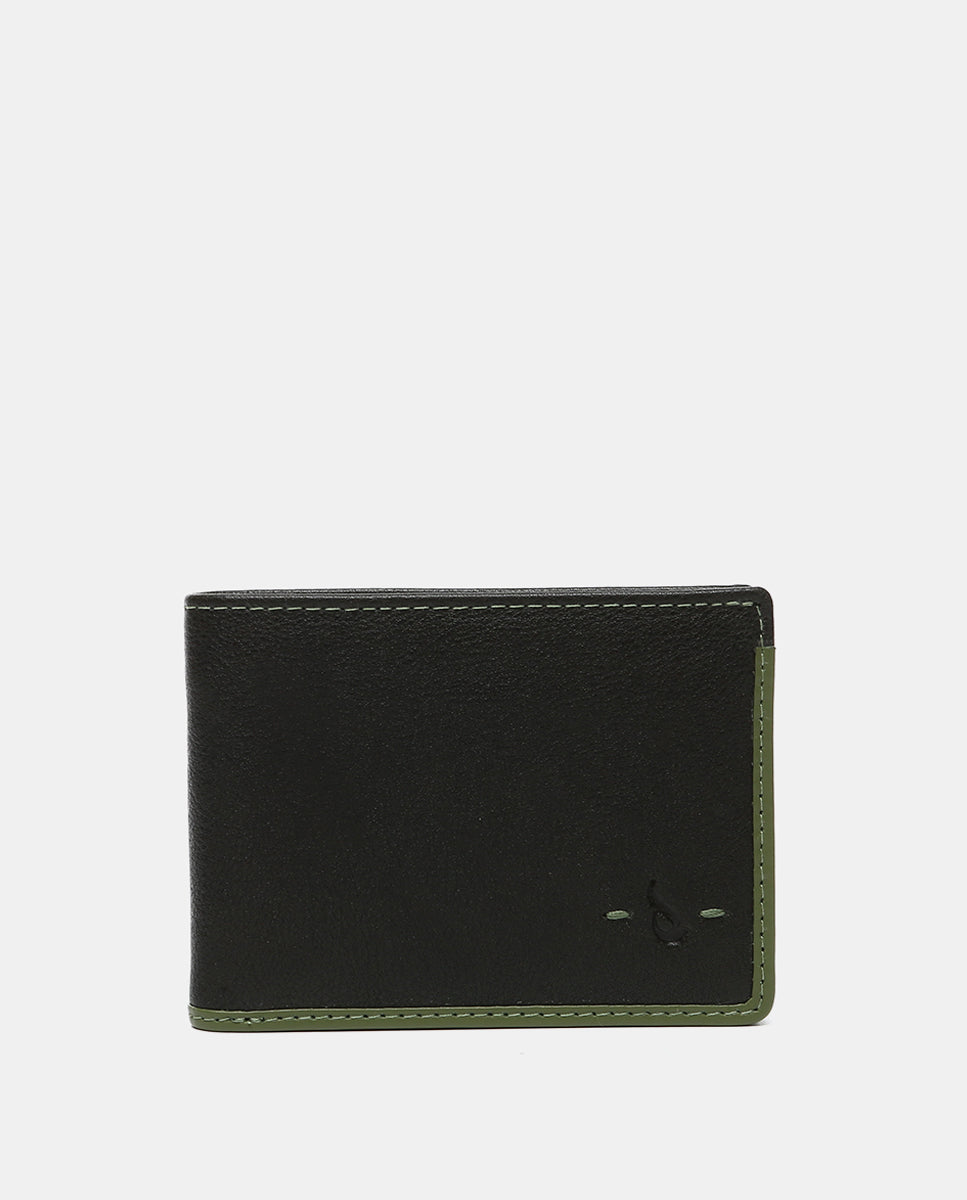 Small men’s wallet made of cowhide leather. Its exterior features a fine color stripe that contrasts with the main tone and borders its edges. A very practical model with several organizational compartments for cards and bills. It also includes an interior coin pocket. RFID protection system.