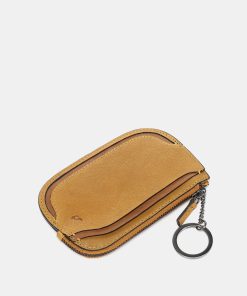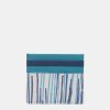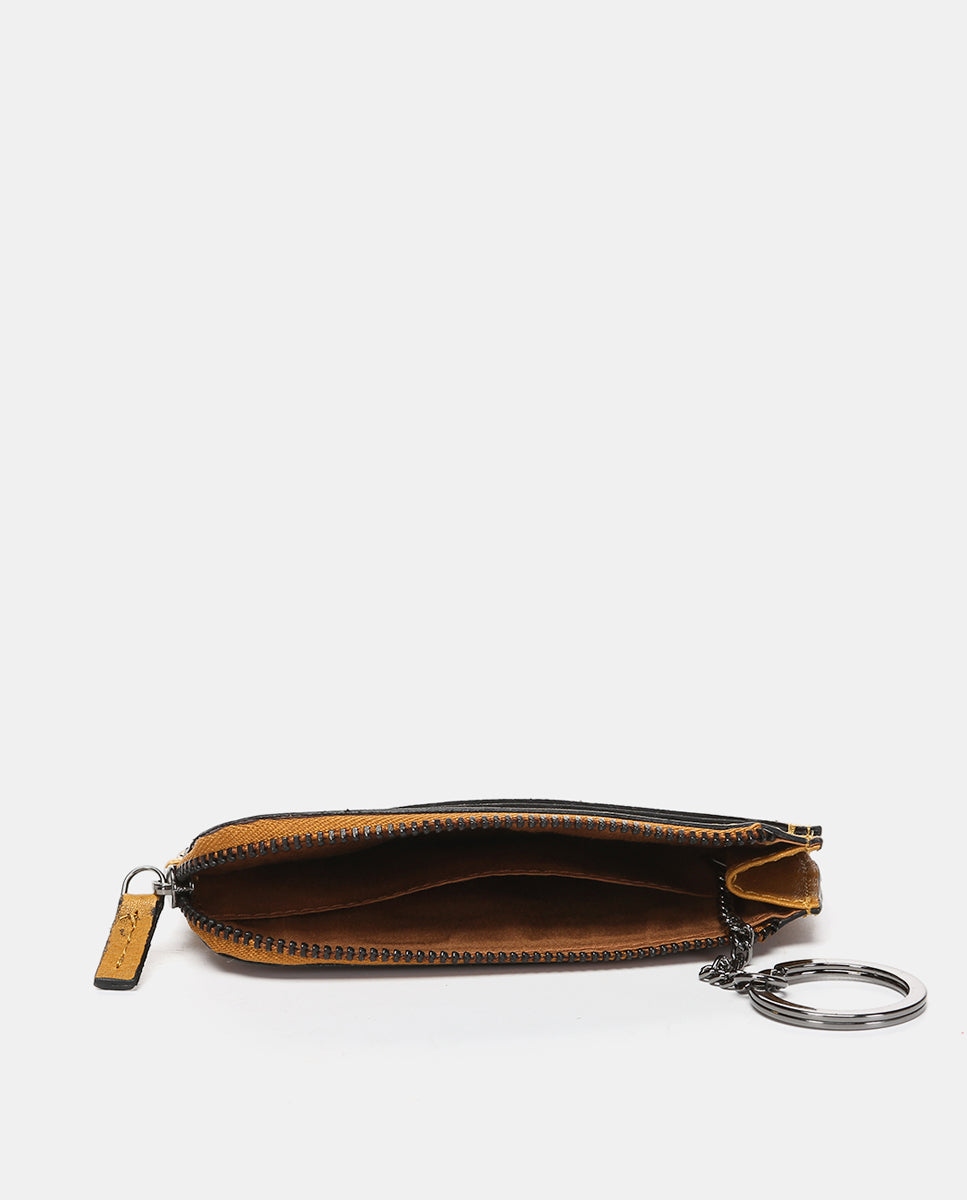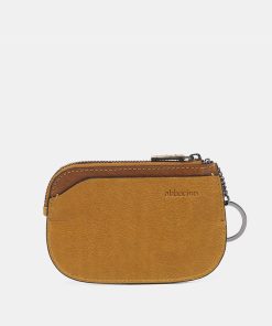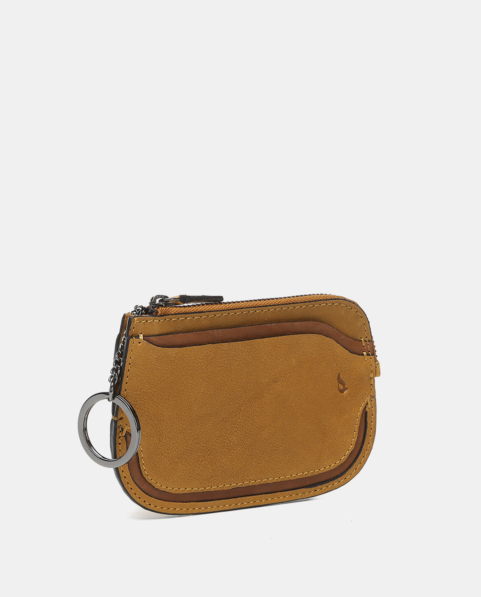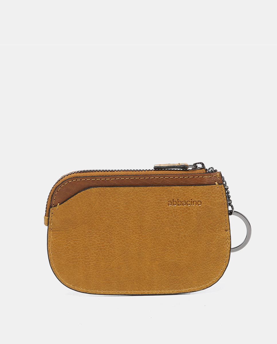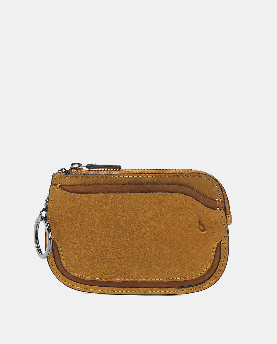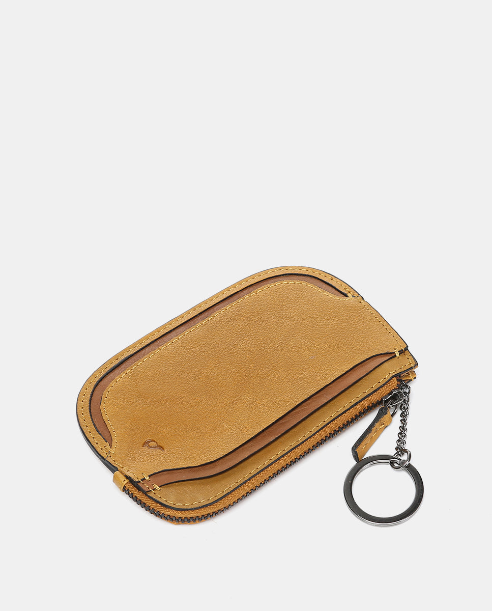 Women’s semicircular cardholder made of leather, featuring a fine curved stripe that contrasts with the main color of the accessory. Its main features are:
